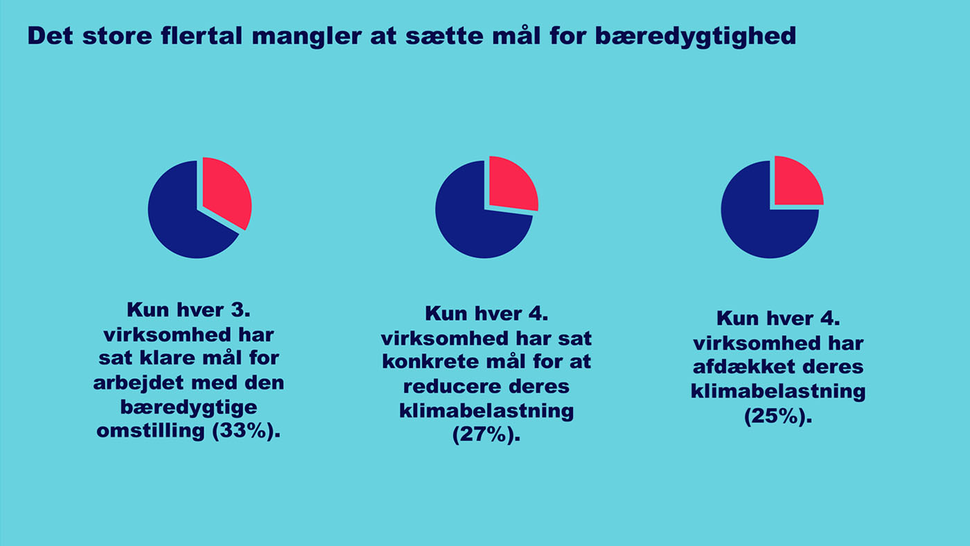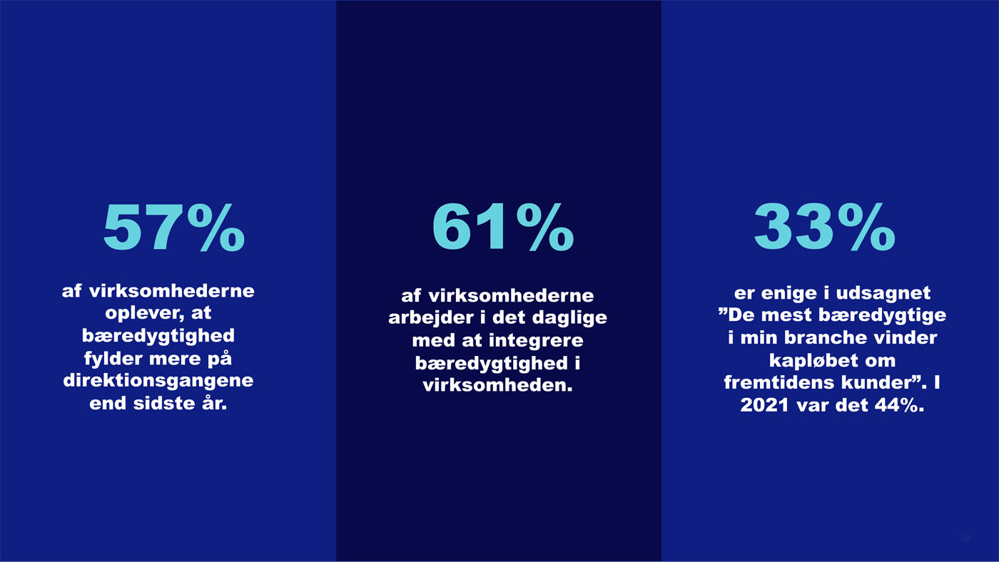 Mere end halvdelen af virksomhederne svarer, at bæredygtighed fylder mere på direktionsgangen end året før, og 61 procent arbejder i det daglige med at integrere bæredygtighed i virksomheden. Til gengæld falder andelen af virksomheder, der tror, at det er de mest bæredygtige virksomheder, der vinder fremtidens kunder.