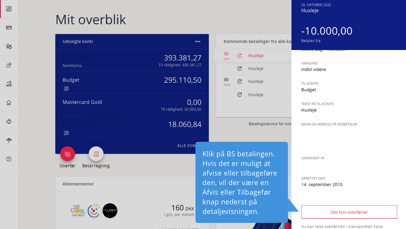 Når du selv opretter den faste overførsel, kan du også selv slette den igen eller ændre fx beløbets størrelse uden gebyr. Sådan gør du: