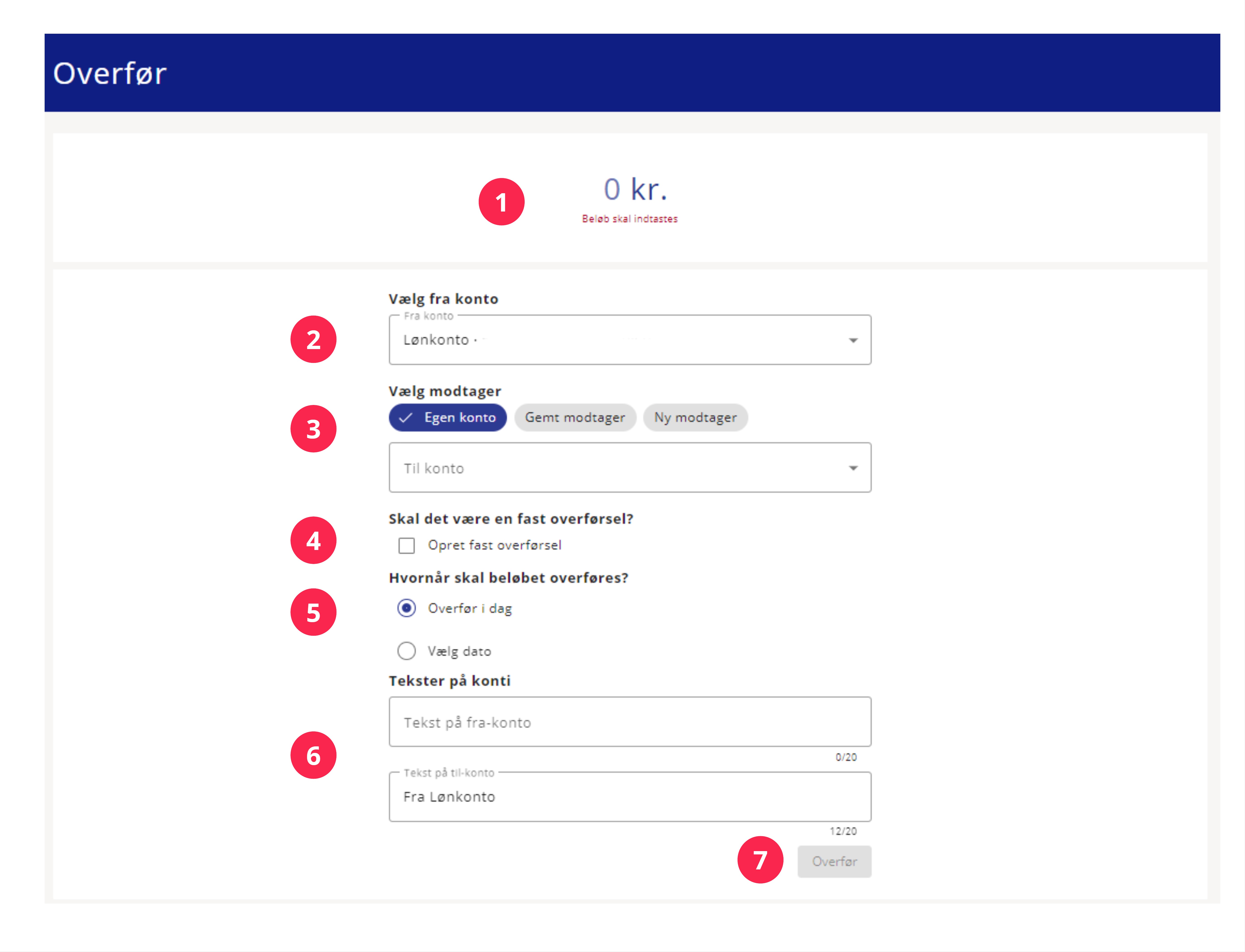 Følg disse trin, når du skal lave en overførsel (se billede nedenfor):
