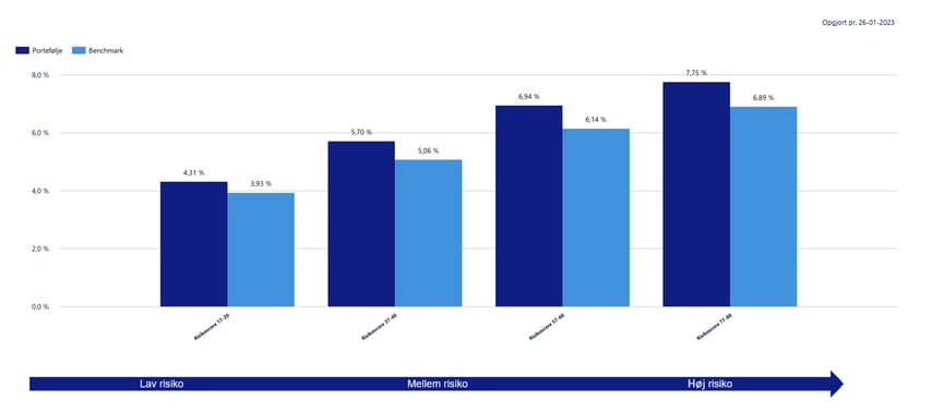 I Privat Portefølje holder vi også vores resultater op mod benchmark og vores konkurrenter i markedet. I disse analyser indgår også en vurdering af risikoen i de respektive porteføljer. Hvis du vil vide mere om vores analyser af afkastet, er du velkommen til at kontakte os.